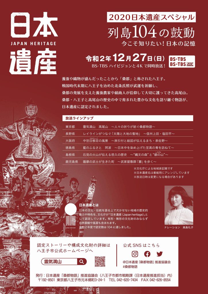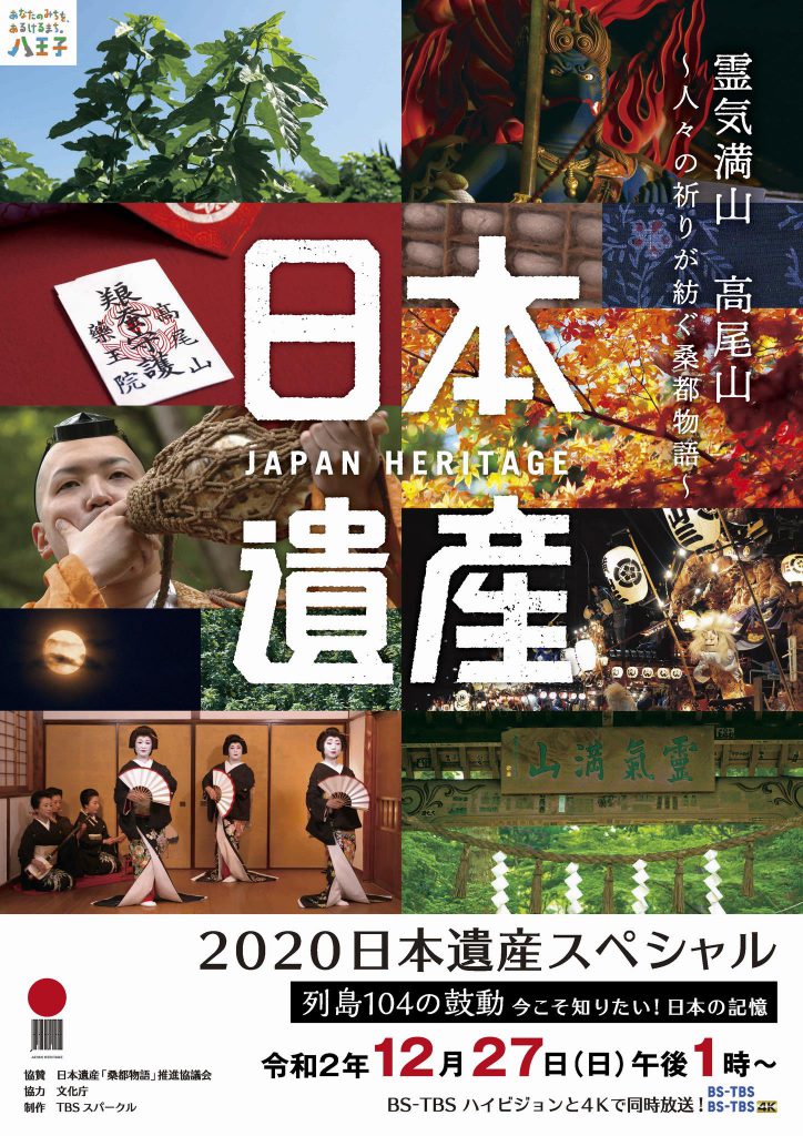 日本遺産に認定された「霊気満山 高尾山 ~人々の祈りが紡ぐ桑都物語~」が2020日本遺産スペシャルにて紹介されます。むーちゃんスタンプラリーでたくさんの方に訪れていただいた場所も紹介されると思います。ぜひ、ご覧ください。