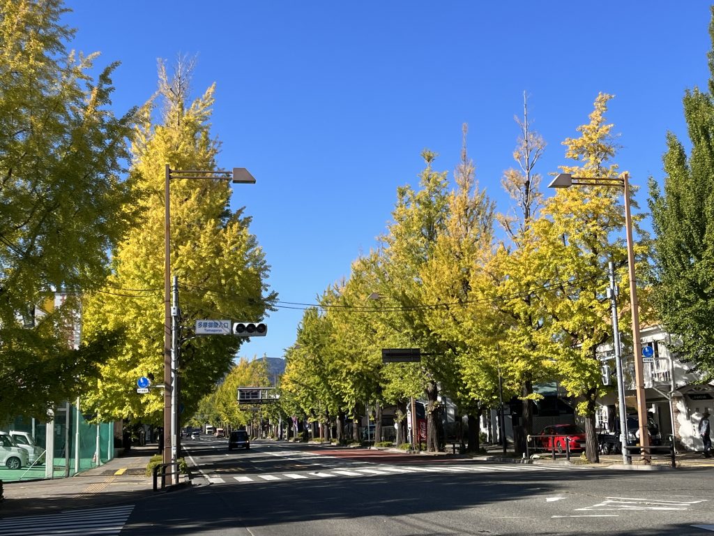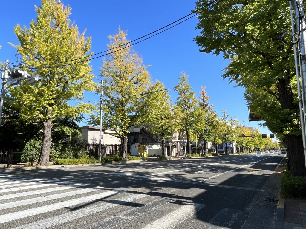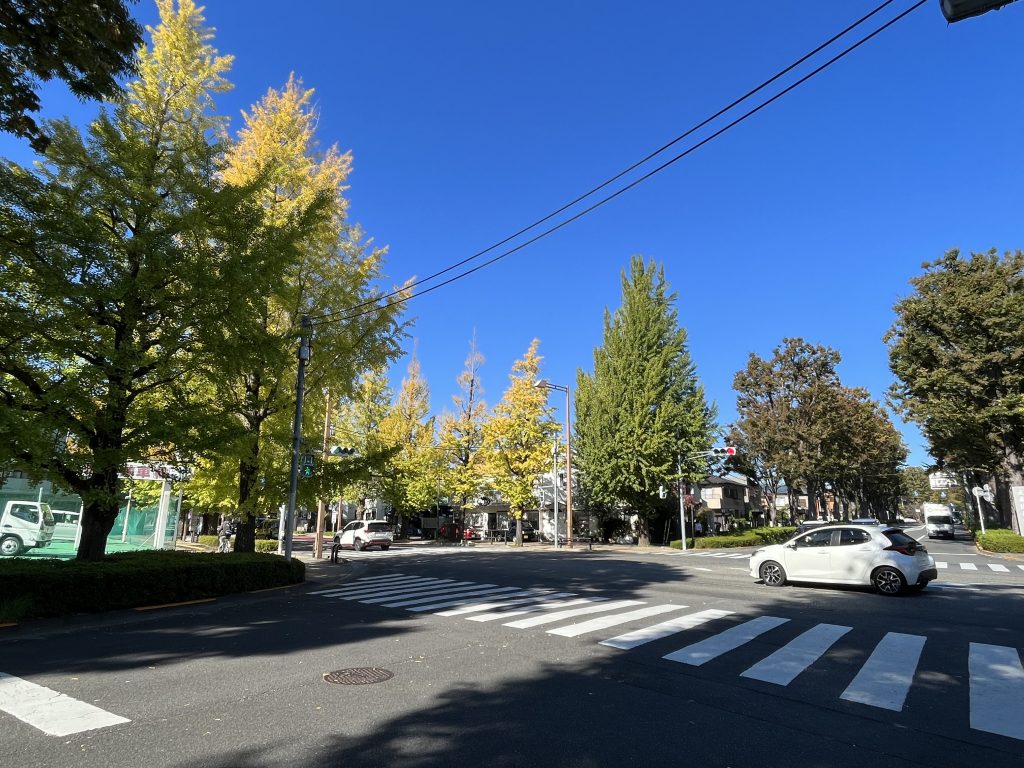 甲州街道いちょう並木も高尾方面から色づき始めてまいりました。今朝は、真っ青な空にいちょうの木がとてもよく映えておりました。これからますます秋晴れの空に映えることでしょう。